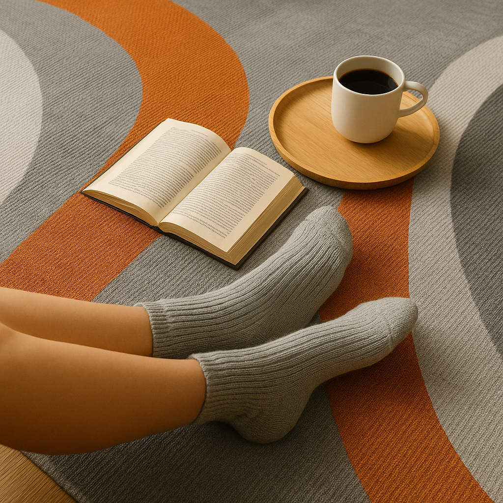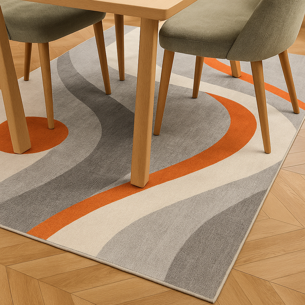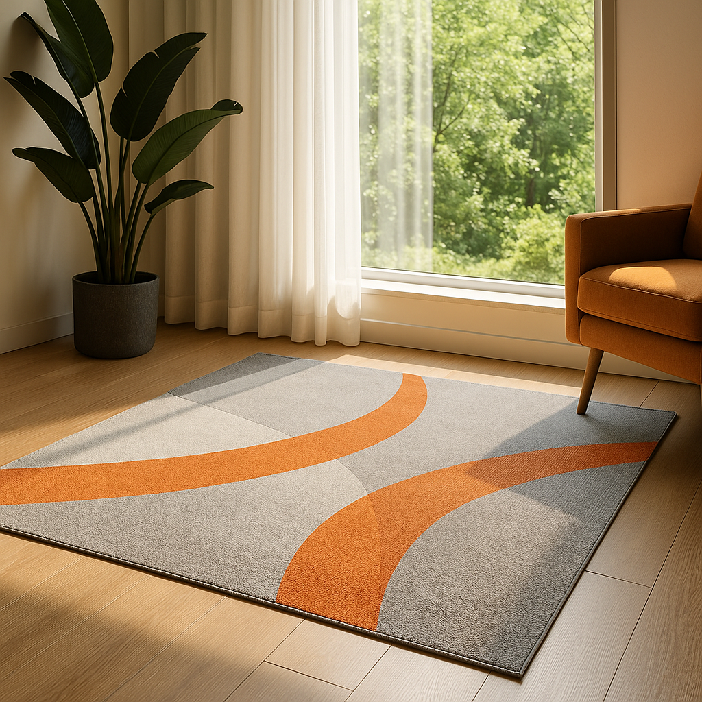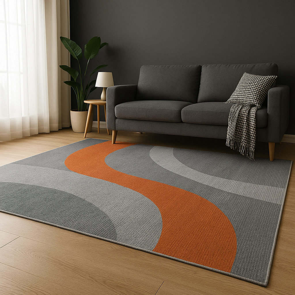 A bold modern accent with flowing saffron waves over layered greys, adding energy without visual clutter. The smooth, plush hand feels inviting underfoot, while the graphic curves tie together neutral furniture and warm wood floors for a clean, contemporary look.